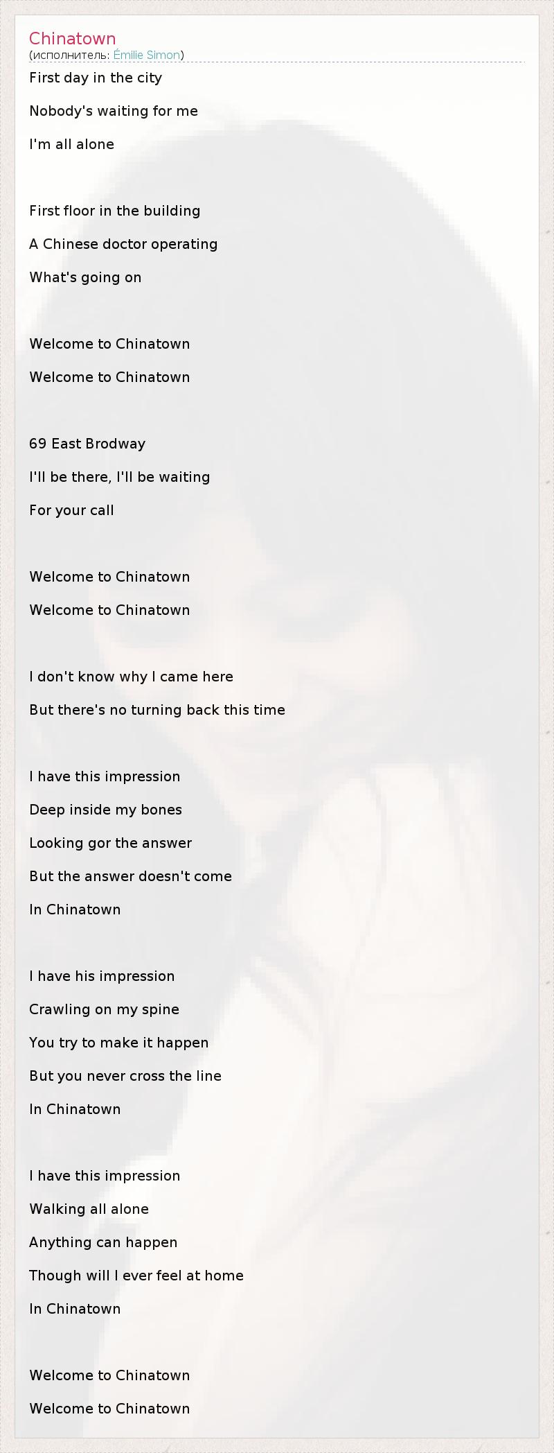 First day in the city Nobody's waiting for me I'm all alone First floor in the building A Chinese doctor operating What's going on Welcome to Chinatown Welcome to Chinatown 69 East Brodway I'll be there, I'll be waiting For your call Welcome to Chinatown Welcome to Chinatown I don't know why I came here But there's no turning back this time I have this impression Deep inside my bones Looking gor the answer But the answer doesn't come In Chinatown I have his impression Crawling on my spine You try to make it happen But you never cross the line In Chinatown I have this impression Walking all alone Anything can happen Though will I ever feel at home In Chinatown Welcome to Chinatown Welcome to Chinatown