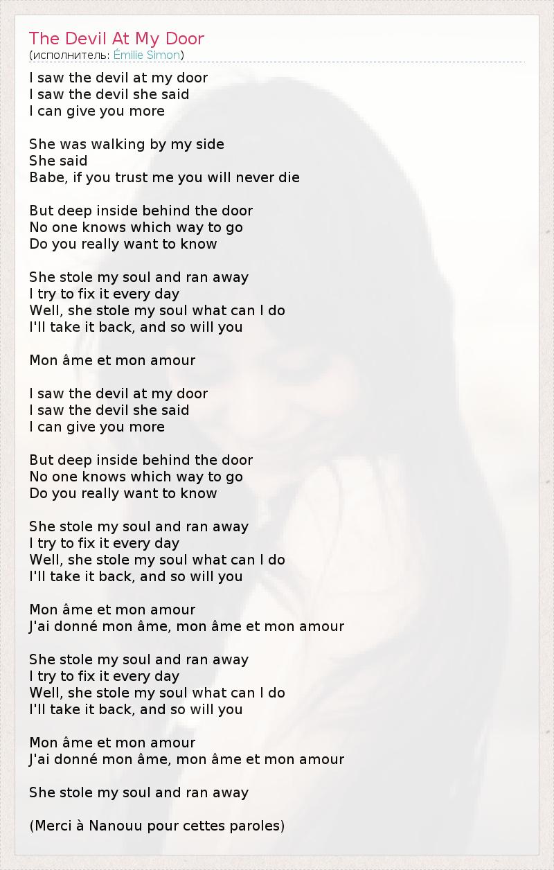 I saw the devil at my door I saw the devil she said I can give you more She was walking by my side She said Babe, if you trust me you will never die But deep inside behind the door No one knows which way to go Do you really want to know She stole my soul and ran away I try to fix it every day Well, she stole my soul what can I do I'll take it back, and so will you Mon âme et mon amour I saw the devil at my door I saw the devil she said I can give you more But deep inside behind the door No one knows which way to go Do you really want to know She stole my soul and ran away I try to fix it every day Well, she stole my soul what can I do I'll take it back, and so will you Mon âme et mon amour J'ai donné mon âme, mon âme et mon amour She stole my soul and ran away I try to fix it every day Well, she stole my soul what can I do I'll take it back, and so will you Mon âme et mon amour J'ai donné mon âme, mon âme et mon amour She stole my soul and ran away (Merci à Nanouu pour cettes paroles)