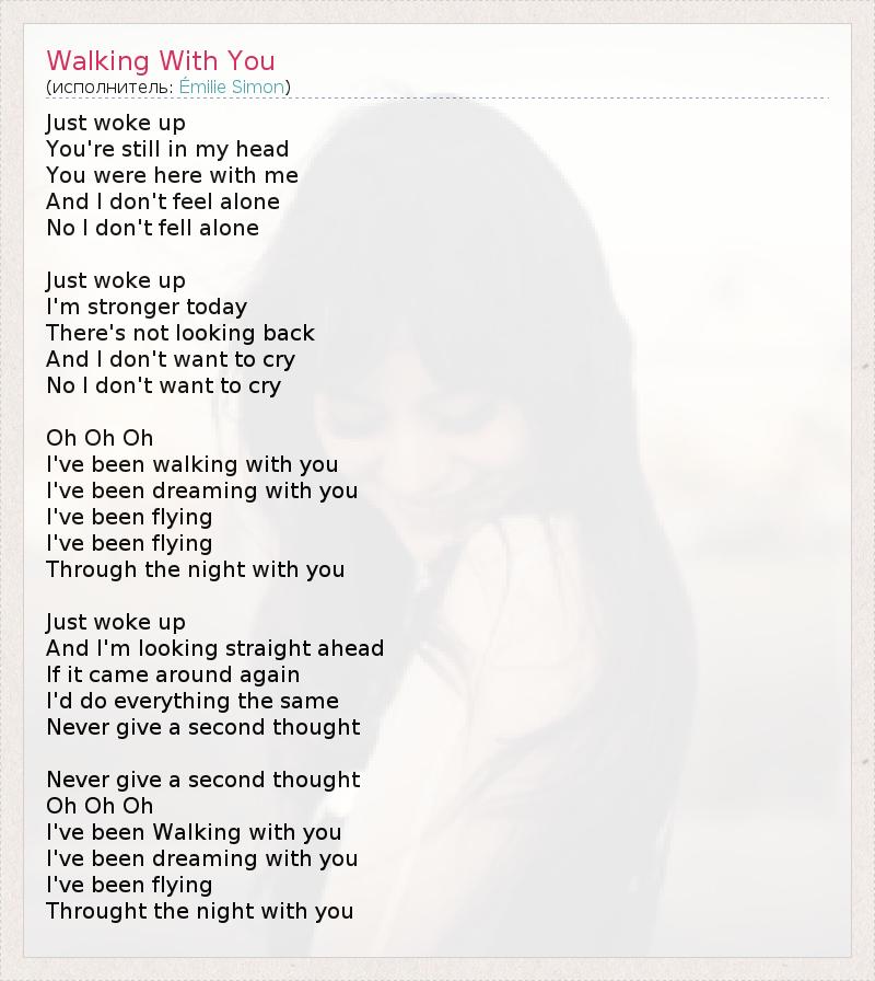 Just woke up You're still in my head You were here with me And I don't feel alone No I don't fell alone Just woke up I'm stronger today There's not looking back And I don't want to cry No I don't want to cry Oh Oh Oh I've been walking with you I've been dreaming with you I've been flying I've been flying Through the night with you Just woke up And I'm looking straight ahead If it came around again I'd do everything the same Never give a second thought Never give a second thought Oh Oh Oh I've been Walking with you I've been dreaming with you I've been flying Throught the night with you