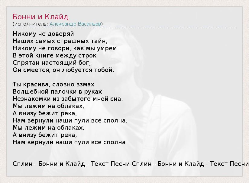 Никому не доверяй Наших самых страшных тайн, Никому не говори, как мы умрем. В этой книге между строк Спрятан настоящий бог, Он смеется, он любуется тобой. Ты красива, словно взмах Волшебной палочки в руках Незнакомки из забытого мной сна. Мы лежим на облаках, А внизу бежит река, Нам вернули наши пули все сполна. Мы лежим на облаках, А внизу бежит река, Нам вернули наши пули все сполна Сплин - Бонни и Клайд - Текст Песни Сплин - Бонни и Клайд - Текст Песни