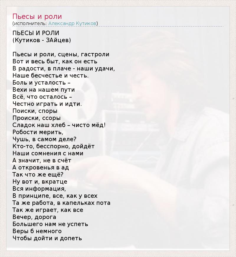 ПЬЕСЫ И РОЛИ (Кутиков - ЗАйцев) Пьесы и роли, сцены, гастроли Вот и весь быт, как он есть В радости, в плаче - наши удачи, Наше бесчестье и честь. Боль и усталость – Вехи на нашем пути Всё, что осталось – Честно играть и идти. Поиски, споры Происки, ссоры Сладок наш хлеб – чисто мёд! Робости мерить, Чушь, в самом деле? Кто-то, бесспорно, дойдёт Наши сомнения с нами А значит, не в счёт А откровенья в ад Так что же ещё? Ну вот и, вкратце Вся информация, В принципе, все, как у всех Та же работа, в капельках пота Так же играет, как все Вечер, дорога Большего нам не успеть Веры б немного Чтобы дойти и допеть