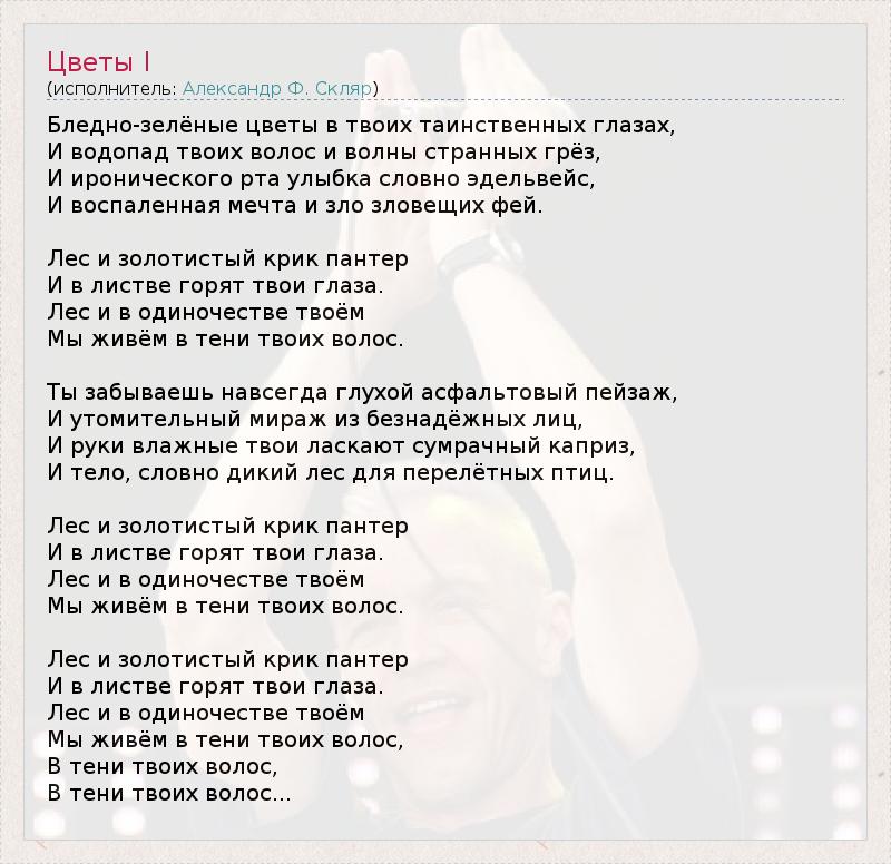Это интересно:Александр Феликсович Скляр родился 7 марта 1958 года в Москве. Музыкант, автор песен, радиоведущий, актёр. Музыкальную карьеру начинал гитаристом групп Василия Шумова «777» и «Центр». Затем, в 1986-м году, создал собственный проект «Ва-Банкъ». В середине 1990-х параллельно начал сольную карьеру. Долгие годы он возглавлял движение «Учитесь плавать», пропагандирующее здоровый образ жизни, и вел... продолжение