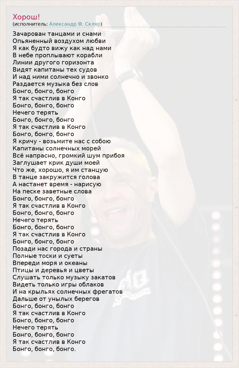 Зачарован танцами и снами Опьяненный воздухом любви Я как будто вижу как над нами В небе проплывают корабли Линии другого горизонта Видят капитаны тех судов И над ними солнечно и звонко Раздается музыка без слов Бонго, бонго, бонго Я так счастлив в Конго Бонго, бонго, бонго Нечего терять Бонго, бонго, бонго Я так счастлив в Конго Бонго, бонго, бонго Я кричу - возьмите нас с собою Капитаны солнечных морей Всё напрасно, громкий шум прибоя Заглушает крик души моей Что же, хорошо, я им станцую В танце закружится голова А настанет время - нарисую На песке заветные слова Бонго, бонго, бонго Я так счастлив в Конго Бонго, бонго, бонго Нечего терять Бонго, бонго, бонго Я так счастлив в Конго Бонго, бонго, бонго Позади нас города и страны Полные тоски и суеты Впереди моря и океаны Птицы и деревья и цветы Слушать только музыку закатов Видеть только игры облаков И на крыльях солнечных фрегатов Дальше от унылых берегов Бонго, бонго, бонго Я так счастлив в Конго Бонго, бонго, бонго Нечего терять Бонго, бонго, бонго Я так счастлив в Конго Бонго, бонго, бонго.