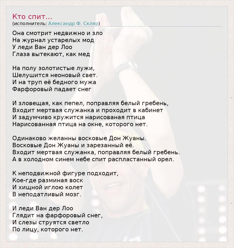 Она смотрит недвижно и зло На журнал устарелых мод У леди Ван дер Лоо Глаза вытекают, как мед На полу золотистые лужи, Шелушится неоновый свет. И на труп её бедного мужа Фарфоровый падает снег И зловещая, как пепел, поправляя белый гребень, Входит мертвая служанка и проходит в кабинет И задумчиво кружится нарисованая птица Нарисованная птица на окне, которого нет. Одинаково желанны восковые Дон Жуаны. Восковые Дон Жуаны и зарезанный её. Входит мертвая служанка, поправляя белый гребень. А в холодном синем небе спит распластанный орел. К неподвижной фигуре подходит, Кое-где разминая воск И хищной иглою колет В неподатливый мозг. И леди Ван дер Лоо Глядит на фарфоровый снег, И слезы струятся светло По лицу, которого нет.