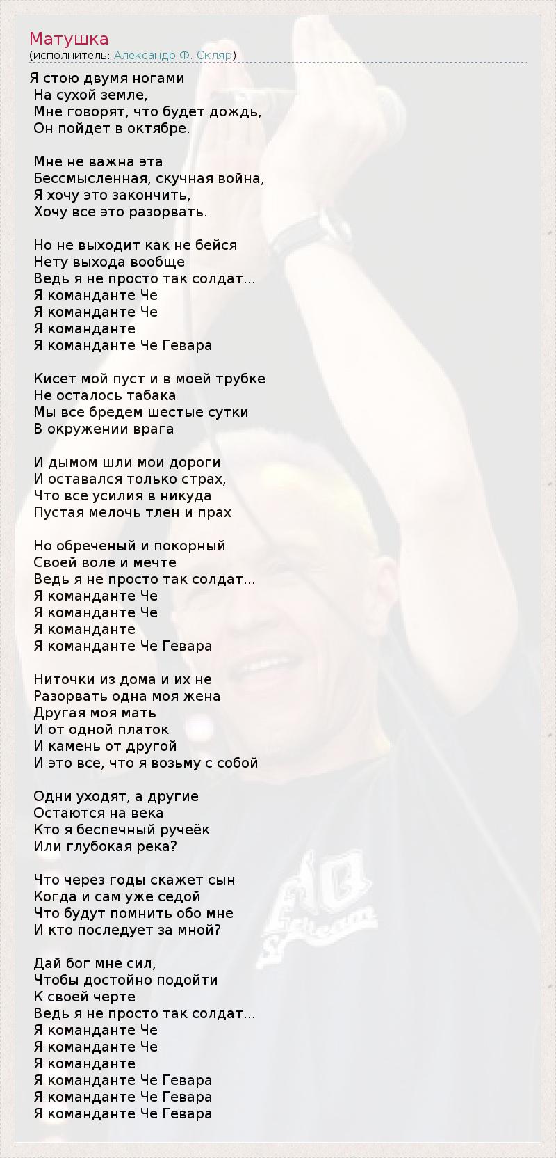 Я стою двумя ногами На сухой земле, Мне говорят, что будет дождь, Он пойдет в октябре. Мне не важна эта Бессмысленная, скучная война, Я хочу это закончить, Хочу все это разорвать. Но не выходит как не бейся Нету выхода вообще Ведь я не просто так солдат... Я команданте Че Я команданте Че Я команданте Я команданте Че Гевара Кисет мой пуст и в моей трубке Не осталось табака Мы все бредем шестые сутки В окружении врага И дымом шли мои дороги И оставался только страх, Что все усилия в никуда Пустая мелочь тлен и прах Но обреченый и покорный Своей воле и мечте Ведь я не просто так солдат... Я команданте Че Я команданте Че Я команданте Я команданте Че Гевара Ниточки из дома и их не Разорвать одна моя жена Другая моя мать И от одной платок И камень от другой И это все, что я возьму с собой Одни уходят, а другие Остаются на века Кто я беспечный ручеёк Или глубокая река? Что через годы скажет сын Когда и сам уже седой Что будут помнить обо мне И кто последует за мной? Дай бог мне сил, Чтобы достойно подойти К своей черте Ведь я не просто так солдат... Я команданте Че Я команданте Че Я команданте Я команданте Че Гевара Я команданте Че Гевара Я команданте Че Гевара