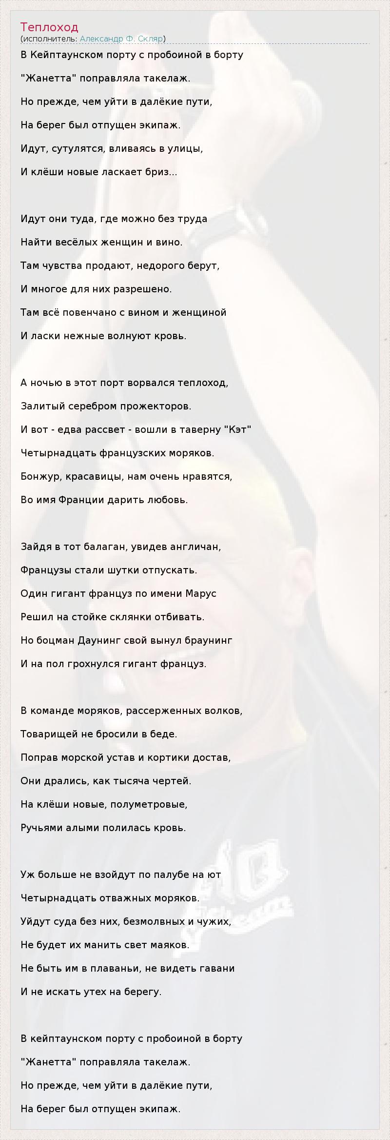 В Кейптаунском порту с пробоиной в борту "Жанетта" поправляла такелаж. Но прежде, чем уйти в далёкие пути, На берег был отпущен экипаж. Идут, сутулятся, вливаясь в улицы, И клёши новые ласкает бриз... Идут они туда, где можно без труда Найти весёлых женщин и вино. Там чувства продают, недорого берут, И многое для них разрешено. Там всё повенчано с вином и женщиной И ласки нежные волнуют кровь. А ночью в этот порт ворвался теплоход, Залитый серебром прожекторов. И вот - едва рассвет - вошли в таверну "Кэт" Четырнадцать французских моряков. Бонжур, красавицы, нам очень нравятся, Во имя Франции дарить любовь. Зайдя в тот балаган, увидев англичан, Французы стали шутки отпускать. Один гигант француз по имени Марус Решил на стойке склянки отбивать. Но боцман Даунинг свой вынул браунинг И на пол грохнулся гигант француз. В команде моряков, рассерженных волков, Товарищей не бросили в беде. Поправ морской устав и кортики достав, Они дрались, как тысяча чертей. На клёши новые, полуметровые, Ручьями алыми полилась кровь. Уж больше не взойдут по палубе на ют Четырнадцать отважных моряков. Уйдут суда без них, безмолвных и чужих, Не будет их манить свет маяков. Не быть им в плаваньи, не видеть гавани И не искать утех на берегу. В кейптаунском порту с пробоиной в борту "Жанетта" поправляла такелаж. Но прежде, чем уйти в далёкие пути, На берег был отпущен экипаж.