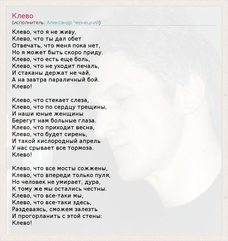 Клево, что я не живу, Клево, что ты дал обет Отвечать, что меня пока нет, Но я может быть скоро приду. Клево, что есть еще боль, Клево, что не уходит печаль, И стаканы держат не чай, А на завтра параличный бой. Клево! Клево, что стекает слеза, Клево, что по сердцу трещины, И наши юные женщины Берегут нам больные глаза. Клево, что приходит весна, Клево, что будет сирень, И такой кислородный апрель У нас срывает все тормоза. Клево! Клево, что все мосты сожжены, Клево, что впереди только пуля, Но человек не умирает, дура, К тому же мы остались честны. Клево, что все-таки мы, Клево, что все-таки здесь, Раздеваясь, сможем залезть И прогорланить с этой стены: Клево!