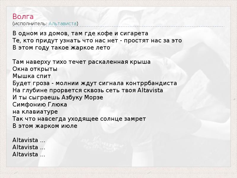 В одном из домов, там где кофе и сигарета Те, кто придут узнать что нас нет - простят нас за это В этом году такое жаркое лето Там наверху тихо течет раскаленная крыша Окна открыты Мышка спит Будет гроза - молнии ждут сигнала контррбандиста На глубине прорвется сквозь сеть твоя Altavista И ты сыграешь Азбуку Морзе Симфонию Глюка на клавиатуре Так что навсегда уходящее солнце замрет В этом жарком июле Altavista ... Altavista ... Altavista ...