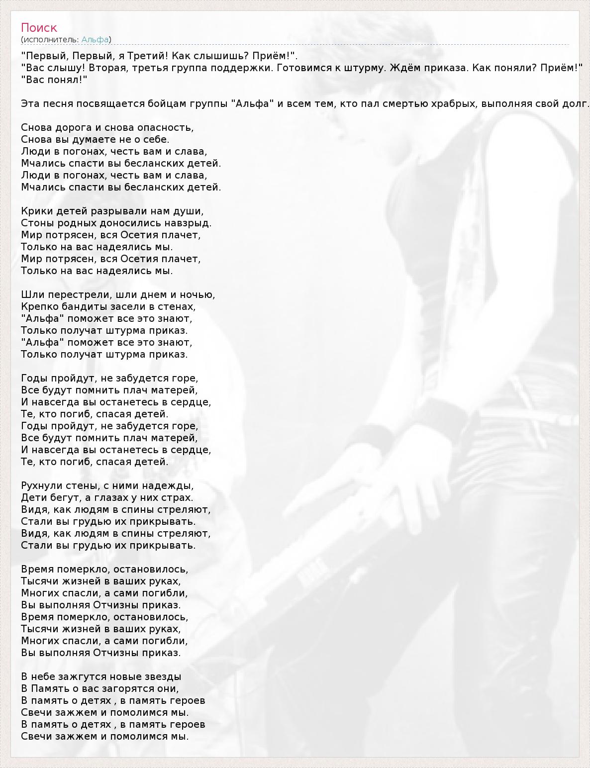 Эта песня посвящается бойцам группы "Альфа" и всем тем, кто пал смертью храбрых, выполняя свой долг.