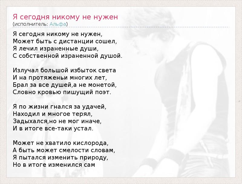 ГлавнаяИсполнителиАльфаЯ сегодня никому не нужен
