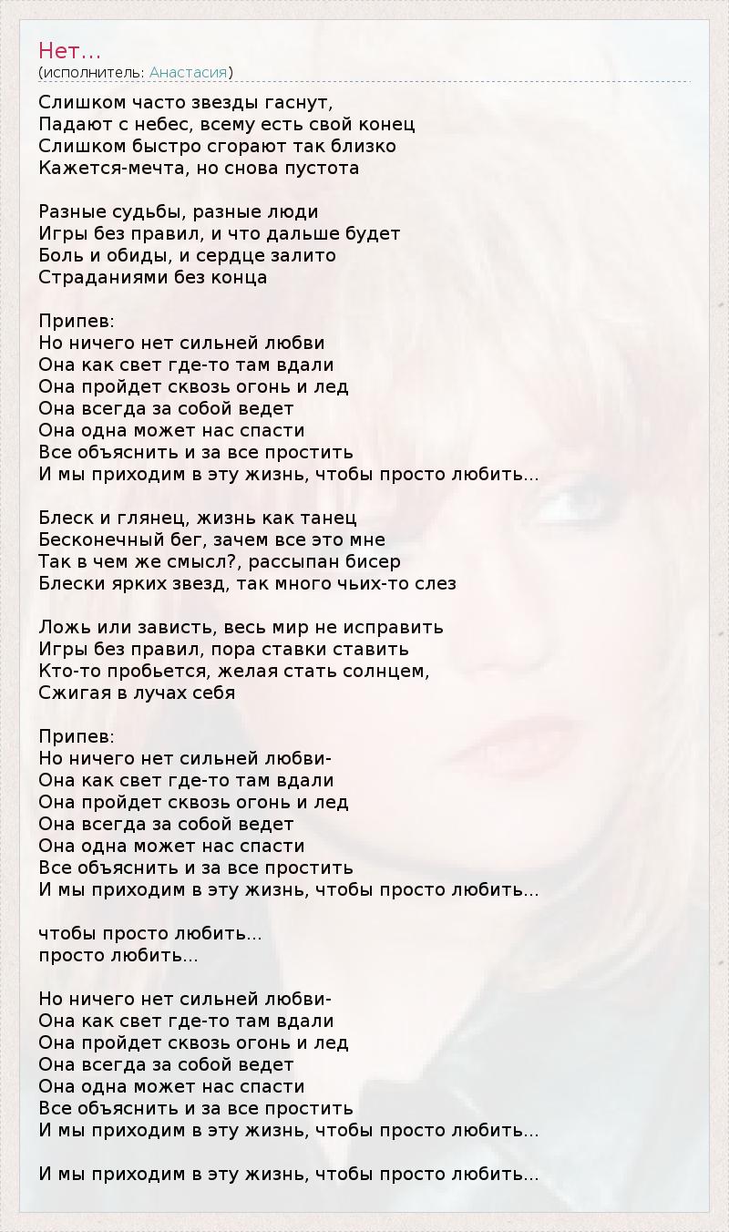 Слишком часто звезды гаснут, Падают с небес, всему есть свой конец Слишком быстро сгорают так близко Кажется-мечта, но снова пустота Разные судьбы, разные люди Игры без правил, и что дальше будет Боль и обиды, и сердце залито Страданиями без конца Припев: Но ничего нет сильней любви Она как свет где-то там вдали Она пройдет сквозь огонь и лед Она всегда за собой ведет Она одна может нас спасти Все объяснить и за все простить И мы приходим в эту жизнь, чтобы просто любить... Блеск и глянец, жизнь как танец Бесконечный бег, зачем все это мне Так в чем же смысл?, рассыпан бисер Блески ярких звезд, так много чьих-то слез Ложь или зависть, весь мир не исправить Игры без правил, пора ставки ставить Кто-то пробьется, желая стать солнцем, Сжигая в лучах себя Припев: Но ничего нет сильней любви- Она как свет где-то там вдали Она пройдет сквозь огонь и лед Она всегда за собой ведет Она одна может нас спасти Все объяснить и за все простить И мы приходим в эту жизнь, чтобы просто любить... чтобы просто любить... просто любить... Но ничего нет сильней любви- Она как свет где-то там вдали Она пройдет сквозь огонь и лед Она всегда за собой ведет Она одна может нас спасти Все объяснить и за все простить И мы приходим в эту жизнь, чтобы просто любить... И мы приходим в эту жизнь, чтобы просто любить...