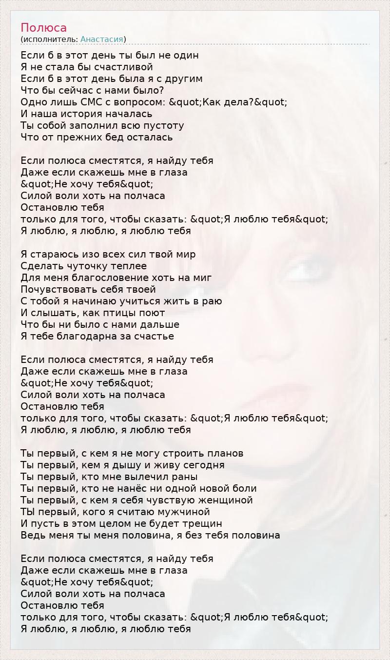 Если б в этот день ты был не один Я не стала бы счастливой Если б в этот день была я с другим Что бы сейчас с нами было? Одно лишь СМС с вопросом: "Как дела?" И наша история началась Ты собой заполнил всю пустоту Что от прежних бед осталась Если полюса сместятся, я найду тебя Даже если скажешь мне в глаза "Не хочу тебя" Силой воли хоть на полчаса Остановлю тебя только для того, чтобы сказать: "Я люблю тебя" Я люблю, я люблю, я люблю тебя Я стараюсь изо всех сил твой мир Сделать чуточку теплее Для меня благословение хоть на миг Почувствовать себя твоей С тобой я начинаю учиться жить в раю И слышать, как птицы поют Что бы ни было с нами дальше Я тебе благодарна за счастье Если полюса сместятся, я найду тебя Даже если скажешь мне в глаза "Не хочу тебя" Силой воли хоть на полчаса Остановлю тебя только для того, чтобы сказать: "Я люблю тебя" Я люблю, я люблю, я люблю тебя Ты первый, с кем я не могу строить планов Ты первый, кем я дышу и живу сегодня Ты первый, кто мне вылечил раны Ты первый, кто не нанёс ни одной новой боли Ты первый, с кем я себя чувствую женщиной ТЫ первый, кого я считаю мужчиной И пусть в этом целом не будет трещин Ведь меня ты меня половина, я без тебя половина Если полюса сместятся, я найду тебя Даже если скажешь мне в глаза "Не хочу тебя" Силой воли хоть на полчаса Остановлю тебя только для того, чтобы сказать: "Я люблю тебя" Я люблю, я люблю, я люблю тебя