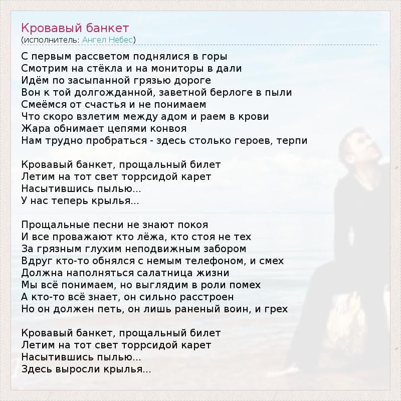 С первым рассветом поднялися в горы Смотрим на стёкла и на мониторы в дали Идём по засыпанной грязью дороге Вон к той долгожданной, заветной берлоге в пыли Смеёмся от счастья и не понимаем Что скоро взлетим между адом и раем в крови Жара обнимает цепями конвоя Нам трудно пробраться - здесь столько героев, терпи Кровавый банкет, прощальный билет Летим на тот свет торрсидой карет Насытившись пылью... У нас теперь крылья... Прощальные песни не знают покоя И все проважают кто лёжа, кто стоя не тех За грязным глухим неподвижным забором Вдруг кто-то обнялся с немым телефоном, и смех Должна наполняться салатница жизни Мы всё понимаем, но выглядим в роли помех А кто-то всё знает, он сильно расстроен Но он должен петь, он лишь раненый воин, и грех Кровавый банкет, прощальный билет Летим на тот свет торрсидой карет Насытившись пылью... Здесь выросли крылья...