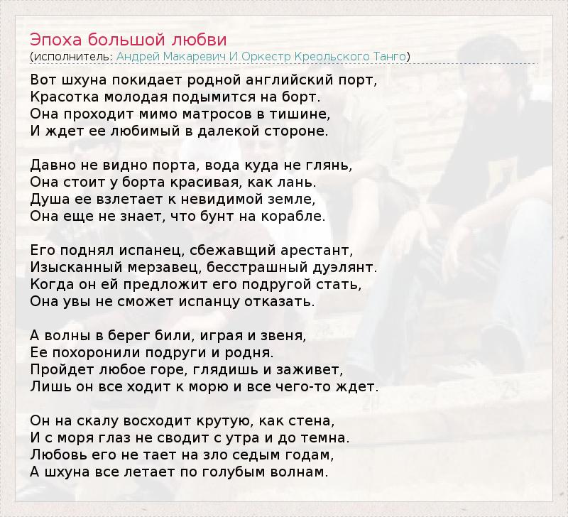 Вот шхуна покидает родной английский порт, Красотка молодая подымится на борт. Она проходит мимо матросов в тишине, И ждет ее любимый в далекой стороне. Давно не видно порта, вода куда не глянь, Она стоит у борта красивая, как лань. Душа ее взлетает к невидимой земле, Она еще не знает, что бунт на корабле. Его поднял испанец, сбежавщий арестант, Изысканный мерзавец, бесстрашный дуэлянт. Когда он ей предложит его подругой стать, Она увы не сможет испанцу отказать. А волны в берег били, играя и звеня, Ее похоронили подруги и родня. Пройдет любое горе, глядишь и заживет, Лишь он все ходит к морю и все чего-то ждет. Он на скалу восходит крутую, как стена, И с моря глаз не сводит с утра и до темна. Любовь его не тает на зло седым годам, А шхуна все летает по голубым волнам.