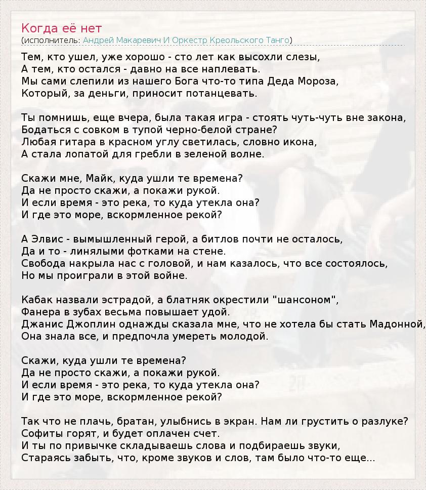Тем, кто ушел, уже хорошо - сто лет как высохли слезы, А тем, кто остался - давно на все наплевать. Мы сами слепили из нашего Бога что-то типа Деда Мороза, Который, за деньги, приносит потанцевать. Ты помнишь, еще вчера, была такая игра - стоять чуть-чуть вне закона, Бодаться с совком в тупой черно-белой стране? Любая гитара в красном углу светилась, словно икона, А стала лопатой для гребли в зеленой волне. Скажи мне, Майк, куда ушли те времена? Да не просто скажи, а покажи рукой. И если время - это река, то куда утекла она? И где это море, вскормленное рекой? А Элвис - вымышленный герой, а битлов почти не осталось, Да и то - линялыми фотками на стене. Свобода накрыла нас с головой, и нам казалось, что все состоялось, Но мы проиграли в этой войне. Кабак назвали эстрадой, а блатняк окрестили "шансоном", Фанера в зубах весьма повышает удой. Джанис Джоплин однажды сказала мне, что не хотела бы стать Мадонной, Она знала все, и предпочла умереть молодой. Скажи, куда ушли те времена? Да не просто скажи, а покажи рукой. И если время - это река, то куда утекла она? И где это море, вскормленное рекой? Так что не плачь, братан, улыбнись в экран. Нам ли грустить о разлуке? Софиты горят, и будет оплачен счет. И ты по привычке складываешь слова и подбираешь звуки, Стараясь забыть, что, кроме звуков и слов, там было что-то еще...