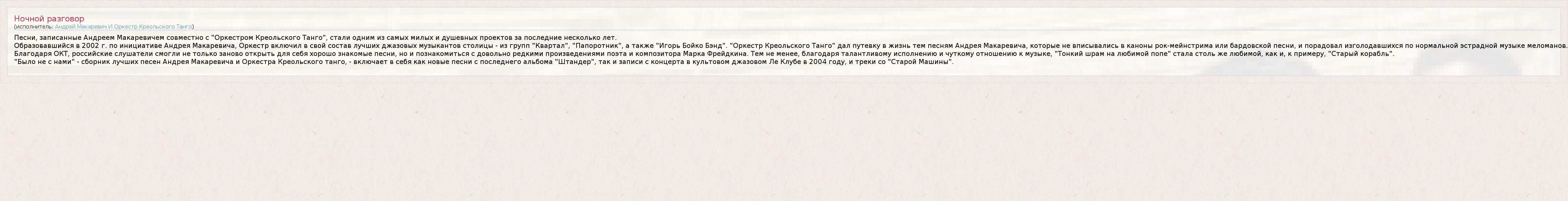 Песни, записанные Андреем Макаревичем совместно с "Оркестром Креольского Танго", стали одним из самых милых и душевных проектов за последние несколько лет. Образовавшийся в 2002 г. по инициативе Андрея Макаревича, Оркестр включил в свой состав лучших джазовых музыкантов столицы - из групп "Квартал", "Папоротник", а также "Игорь Бойко Бэнд". "Оркестр Креольского Танго" дал путевку в жизнь тем песням Андрея Макаревича, которые не вписывались в каноны рок-мейнстрима или бардовской песни, и порадовал изголодавшихся по нормальной эстрадной музыке меломанов. Благодаря ОКТ, российские слушатели смогли не только заново открыть для себя хорошо знакомые песни, но и познакомиться с довольно редкими произведениями поэта и композитора Марка Фрейдкина. Тем не менее, благодаря талантливому исполнению и чуткому отношению к музыке, "Тонкий шрам на любимой попе" стала столь же любимой, как и, к примеру, "Старый корабль". "Было не с нами" - сборник лучших песен Андрея Макаревича и Оркестра Креольского танго, - включает в себя как новые песни с последнего альбома "Штандер", так и записи с концерта в культовом джазовом Ле Клубе в 2004 году, и треки со "Старой Машины".