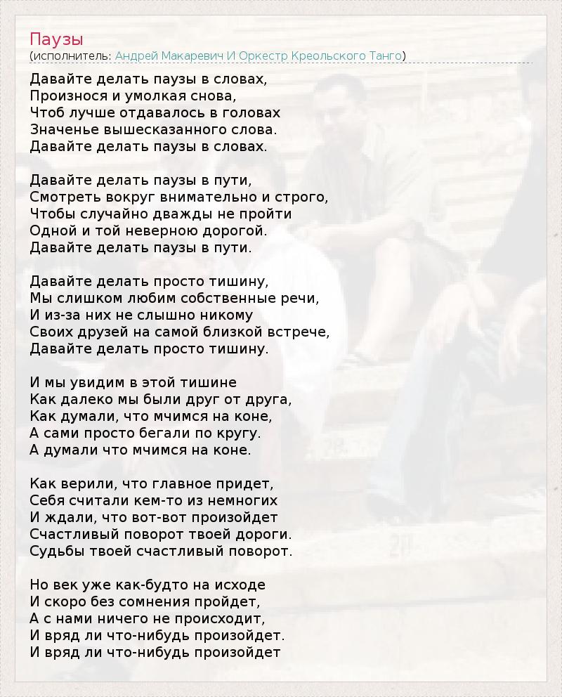 Давайте делать паузы в словах, Произнося и умолкая снова, Чтоб лучше отдавалось в головах Значенье вышесказанного слова. Давайте делать паузы в словах. Давайте делать паузы в пути, Смотреть вокруг внимательно и строго, Чтобы случайно дважды не пройти Одной и той неверною дорогой. Давайте делать паузы в пути. Давайте делать просто тишину, Мы слишком любим собственные речи, И из-за них не слышно никому Своих друзей на самой близкой встрече, Давайте делать просто тишину. И мы увидим в этой тишине Как далеко мы были друг от друга, Как думали, что мчимся на коне, А сами просто бегали по кругу. А думали что мчимся на коне. Как верили, что главное придет, Себя считали кем-то из немногих И ждали, что вот-вот произойдет Счастливый поворот твоей дороги. Судьбы твоей счастливый поворот. Но век уже как-будто на исходе И скоро без сомнения пройдет, А с нами ничего не происходит, И вряд ли что-нибудь произойдет. И вряд ли что-нибудь произойдет