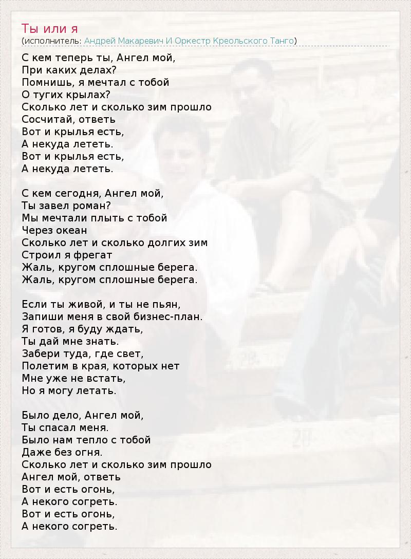 С кем теперь ты, Ангел мой, При каких делах? Помнишь, я мечтал с тобой О тугих крылах? Сколько лет и сколько зим прошло Сосчитай, ответь Вот и крылья есть, А некуда лететь. Вот и крылья есть, А некуда лететь. С кем сегодня, Ангел мой, Ты завел роман? Мы мечтали плыть с тобой Через океан Сколько лет и сколько долгих зим Строил я фрегат Жаль, кругом сплошные берега. Жаль, кругом сплошные берега. Если ты живой, и ты не пьян, Запиши меня в свой бизнес-план. Я готов, я буду ждать, Ты дай мне знать. Забери туда, где свет, Полетим в края, которых нет Мне уже не встать, Но я могу летать. Было дело, Ангел мой, Ты спасал меня. Было нам тепло с тобой Даже без огня. Сколько лет и сколько зим прошло Ангел мой, ответь Вот и есть огонь, А некого согреть. Вот и есть огонь, А некого согреть.