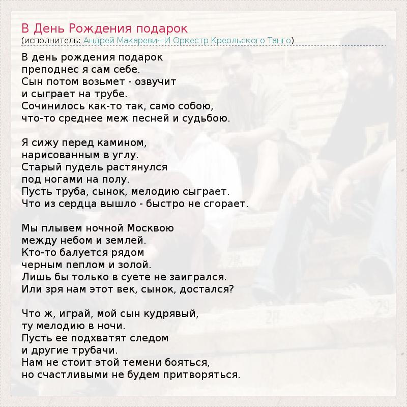 В день рождения подарок преподнес я сам себе. Сын потом возьмет - озвучит и сыграет на трубе. Сочинилось как-то так, само собою, что-то среднее меж песней и судьбою. Я сижу перед камином, нарисованным в углу. Старый пудель растянулся под ногами на полу. Пусть труба, сынок, мелодию сыграет. Что из сердца вышло - быстро не сгорает. Мы плывем ночной Москвою между небом и землей. Кто-то балуется рядом черным пеплом и золой. Лишь бы только в суете не заигрался. Или зря нам этот век, сынок, достался? Что ж, играй, мой сын кудрявый, ту мелодию в ночи. Пусть ее подхватят следом и другие трубачи. Нам не стоит этой темени бояться, но счастливыми не будем притворяться.