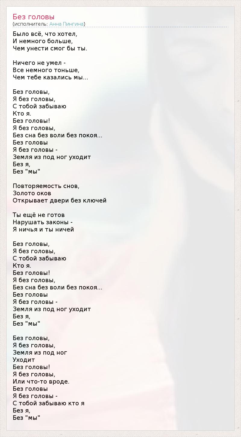 Было всё, что хотел, И немного больше, Чем унести смог бы ты. Ничего не умел - Все немного тоньше, Чем тебе казались мы... Без головы, Я без головы, С тобой забываю Кто я. Без головы! Я без головы, Без сна без воли без покоя... Без головы Я без головы - Земля из под ног уходит Без я, Без "мы" Повторяемость снов, Золото оков Открывает двери без ключей Ты ещё не готов Нарушать законы - Я ничья и ты ничей Без головы, Я без головы, С тобой забываю Кто я. Без головы! Я без головы, Без сна без воли без покоя... Без головы Я без головы - Земля из под ног уходит Без я, Без "мы" Без головы, Я без головы, Земля из под ног Уходит Без головы! Я без головы, Или что-то вроде. Без головы Я без головы - С тобой забываю кто я Без я, Без "мы"