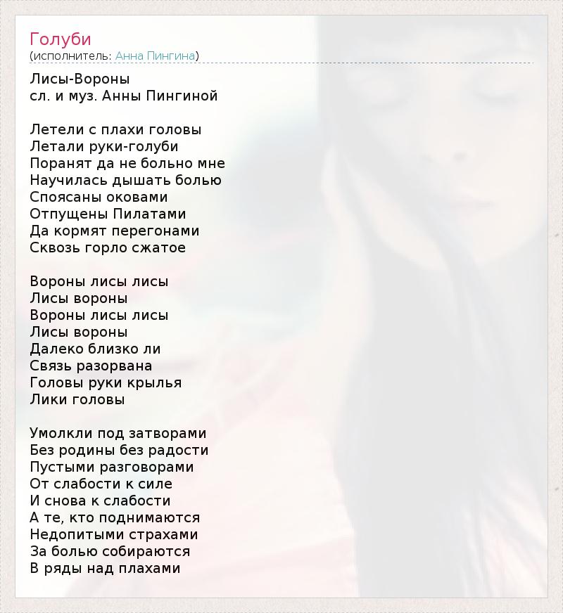 Лисы-Вороны сл. и муз. Анны Пингиной Летели с плахи головы Летали руки-голуби Поранят да не больно мне Научилась дышать болью Споясаны оковами Отпущены Пилатами Да кормят перегонами Сквозь горло сжатое Вороны лисы лисы Лисы вороны Вороны лисы лисы Лисы вороны Далеко близко ли Связь разорвана Головы руки крылья Лики головы Умолкли под затворами Без родины без радости Пустыми разговорами От слабости к силе И снова к слабости А те, кто поднимаются Недопитыми страхами За болью собираются В ряды над плахами