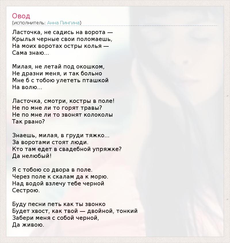 Ласточка, не садись на ворота — Крылья черные свои поломаешь, На моих воротах остры колья — Сама знаю... Милая, не летай под окошком, Не дразни меня, и так больно Мне б с тобою улететь пташкой На волю... Ласточка, смотри, костры в поле! Не по мне ли то горят травы? Не по мне ли то звонят колоколы Так рвано? Знаешь, милая, в груди тяжко... За воротами стоят люди. Кто там едет в свадебной упряжке? Да нелюбый! Я с тобою со двора в поле. Через поле к скалам да к морю. Над водой взлечу тебе черной Сестрою. Буду песни петь как ты звонко Будет хвост, как твой — двойной, тонкий Забери меня с собой черной, Да живою.