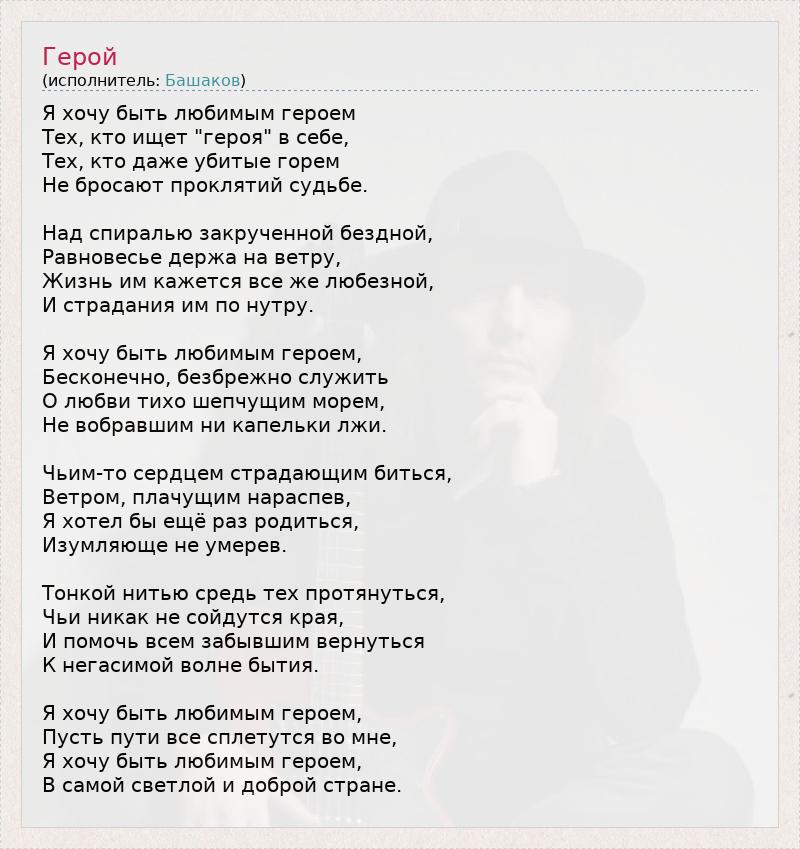 Я хочу быть любимым героем Тех, кто ищет "героя" в себе, Тех, кто даже убитые горем Не бросают проклятий судьбе. Над спиралью закрученной бездной, Равновесье держа на ветру, Жизнь им кажется все же любезной, И страдания им по нутру. Я хочу быть любимым героем, Бесконечно, безбрежно служить О любви тихо шепчущим морем, Не вобравшим ни капельки лжи. Чьим-то сердцем страдающим биться, Ветром, плачущим нараспев, Я хотел бы ещё раз родиться, Изумляюще не умерев. Тонкой нитью средь тех протянуться, Чьи никак не сойдутся края, И помочь всем забывшим вернуться К негасимой волне бытия. Я хочу быть любимым героем, Пусть пути все сплетутся во мне, Я хочу быть любимым героем, В самой светлой и доброй стране.