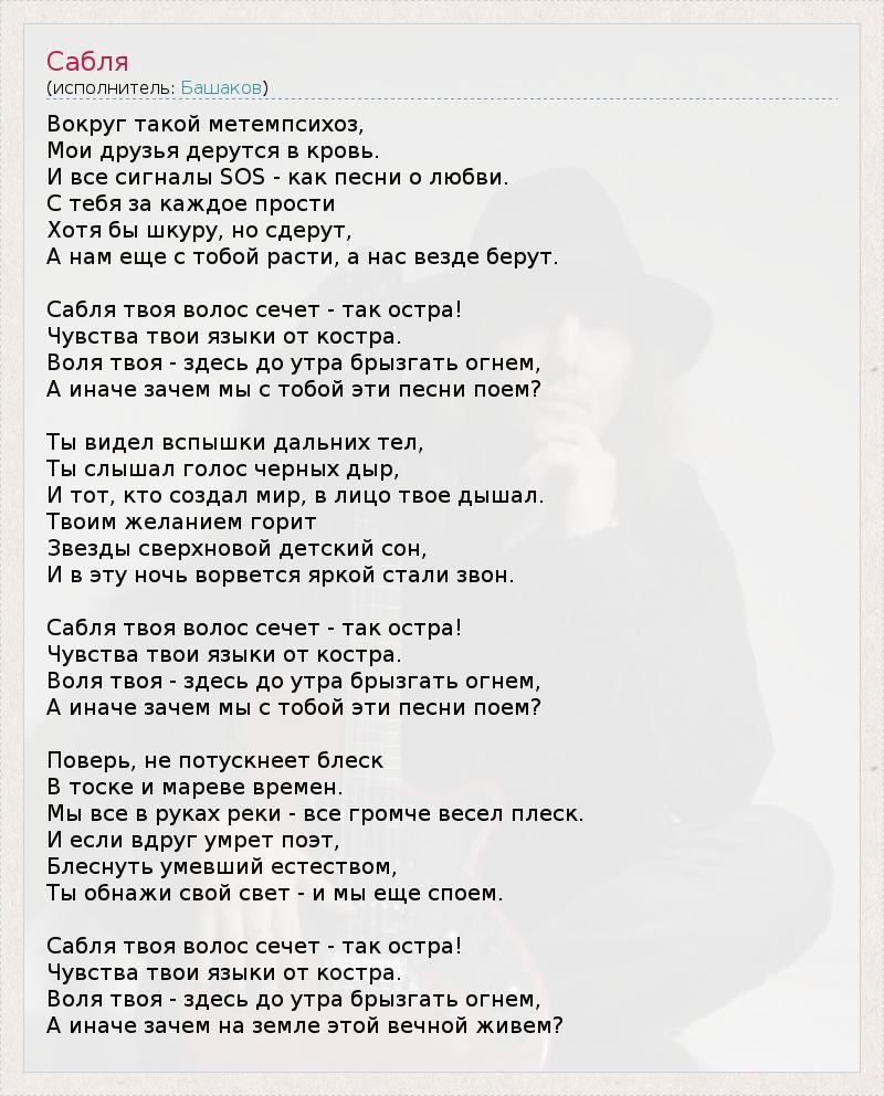 Вокруг такой метемпсихоз, Мои друзья дерутся в кровь. И все сигналы SOS - как песни о любви. С тебя за каждое прости Хотя бы шкуру, но сдерут, А нам еще с тобой расти, а нас везде берут. Сабля твоя волос сечет - так остра! Чувства твои языки от костра. Воля твоя - здесь до утра брызгать огнем, А иначе зачем мы с тобой эти песни поем? Ты видел вспышки дальних тел, Ты слышал голос черных дыр, И тот, кто создал мир, в лицо твое дышал. Твоим желанием горит Звезды сверхновой детский сон, И в эту ночь ворвется яркой стали звон. Сабля твоя волос сечет - так остра! Чувства твои языки от костра. Воля твоя - здесь до утра брызгать огнем, А иначе зачем мы с тобой эти песни поем? Поверь, не потускнеет блеск В тоске и мареве времен. Мы все в руках реки - все громче весел плеск. И если вдруг умрет поэт, Блеснуть умевший естеством, Ты обнажи свой свет - и мы еще споем. Сабля твоя волос сечет - так остра! Чувства твои языки от костра. Воля твоя - здесь до утра брызгать огнем, А иначе зачем на земле этой вечной живем?