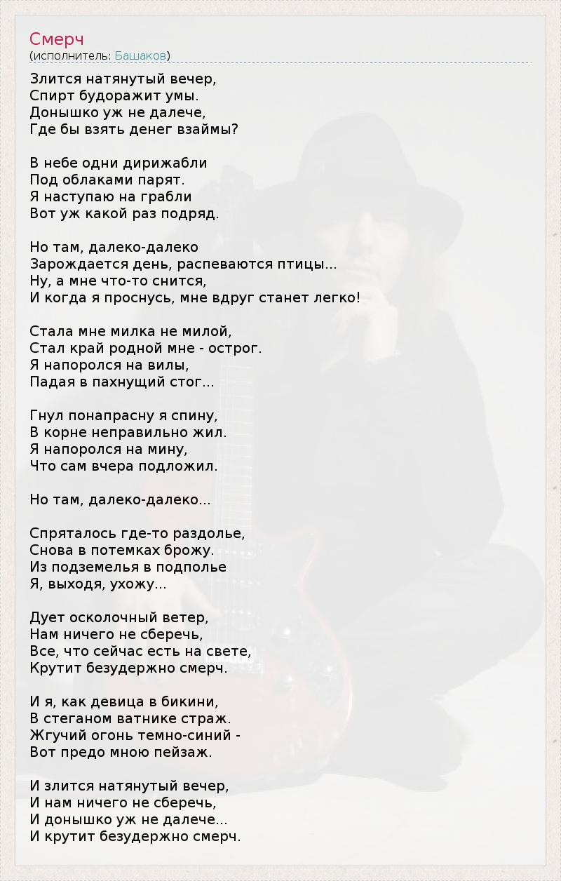 Злится натянутый вечер, Спирт будоражит умы. Донышко уж не далече, Где бы взять денег взаймы? В небе одни дирижабли Под облаками парят. Я наступаю на грабли Вот уж какой раз подряд. Но там, далеко-далеко Зарождается день, распеваются птицы... Ну, а мне что-то снится, И когда я проснусь, мне вдруг станет легко! Стала мне милка не милой, Стал край родной мне - острог. Я напоролся на вилы, Падая в пахнущий стог... Гнул понапрасну я спину, В корне неправильно жил. Я напоролся на мину, Что сам вчера подложил. Но там, далеко-далеко... Спряталось где-то раздолье, Снова в потемках брожу. Из подземелья в подполье Я, выходя, ухожу... Дует осколочный ветер, Нам ничего не сберечь, Все, что сейчас есть на свете, Крутит безудержно смерч. И я, как девица в бикини, В стеганом ватнике страж. Жгучий огонь темно-синий - Вот предо мною пейзаж. И злится натянутый вечер, И нам ничего не сберечь, И донышко уж не далече... И крутит безудержно смерч.