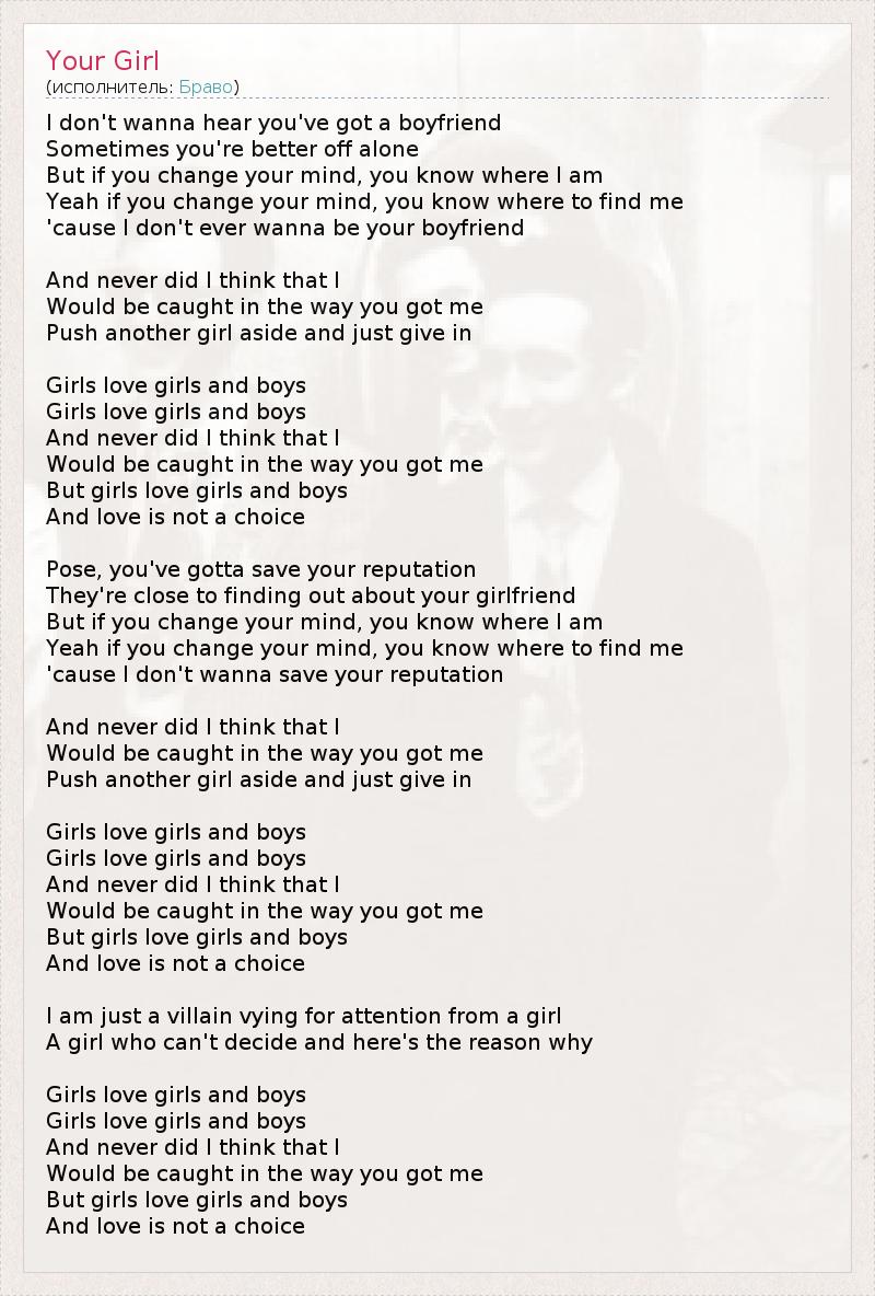 I don't wanna hear you've got a boyfriend Sometimes you're better off alone But if you change your mind, you know where I am Yeah if you change your mind, you know where to find me 'cause I don't ever wanna be your boyfriend And never did I think that I Would be caught in the way you got me Push another girl aside and just give in Girls love girls and boys Girls love girls and boys And never did I think that I Would be caught in the way you got me But girls love girls and boys And love is not a choice Pose, you've gotta save your reputation They're close to finding out about your girlfriend But if you change your mind, you know where I am Yeah if you change your mind, you know where to find me 'cause I don't wanna save your reputation And never did I think that I Would be caught in the way you got me Push another girl aside and just give in Girls love girls and boys Girls love girls and boys And never did I think that I Would be caught in the way you got me But girls love girls and boys And love is not a choice I am just a villain vying for attention from a girl A girl who can't decide and here's the reason why Girls love girls and boys Girls love girls and boys And never did I think that I Would be caught in the way you got me But girls love girls and boys And love is not a choice