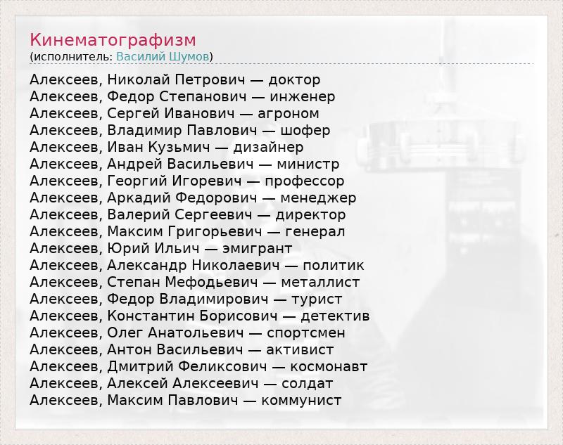Алексеев, Николай Петрович — доктор Алексеев, Федор Степанович — инженер Алексеев, Сергей Иванович — агроном Алексеев, Владимир Павлович — шофер Алексеев, Иван Кузьмич — дизайнер Алексеев, Андрей Васильевич — министр Алексеев, Георгий Игоревич — профессор Алексеев, Аркадий Федорович — менеджер Алексеев, Валерий Сергеевич — директор Алексеев, Максим Григорьевич — генерал Алексеев, Юрий Ильич — эмигрант Алексеев, Александр Николаевич — политик Алексеев, Степан Мефодьевич — металлист Алексеев, Федор Владимирович — турист Алексеев, Константин Борисович — детектив Алексеев, Олег Анатольевич — спортсмен Алексеев, Антон Васильевич — активист Алексеев, Дмитрий Феликсович — космонавт Алексеев, Алексей Алексеевич — солдат Алексеев, Максим Павлович — коммунист