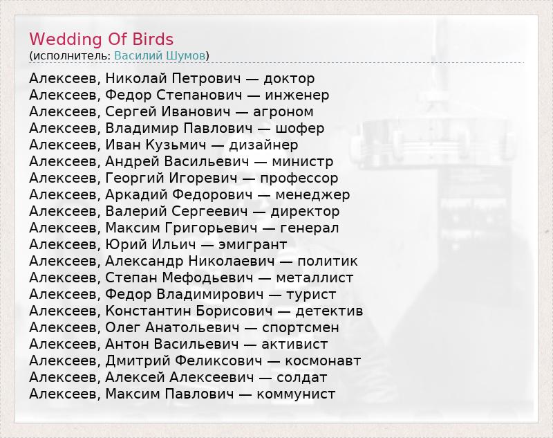 Алексеев, Николай Петрович — доктор Алексеев, Федор Степанович — инженер Алексеев, Сергей Иванович — агроном Алексеев, Владимир Павлович — шофер Алексеев, Иван Кузьмич — дизайнер Алексеев, Андрей Васильевич — министр Алексеев, Георгий Игоревич — профессор Алексеев, Аркадий Федорович — менеджер Алексеев, Валерий Сергеевич — директор Алексеев, Максим Григорьевич — генерал Алексеев, Юрий Ильич — эмигрант Алексеев, Александр Николаевич — политик Алексеев, Степан Мефодьевич — металлист Алексеев, Федор Владимирович — турист Алексеев, Константин Борисович — детектив Алексеев, Олег Анатольевич — спортсмен Алексеев, Антон Васильевич — активист Алексеев, Дмитрий Феликсович — космонавт Алексеев, Алексей Алексеевич — солдат Алексеев, Максим Павлович — коммунист