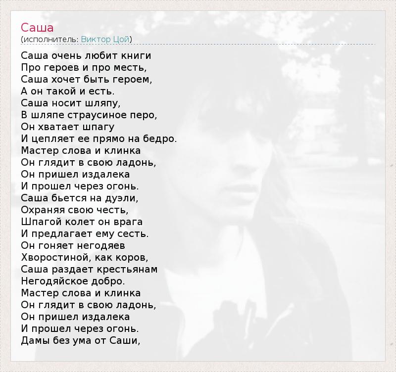 Саша очень любит книги Про героев и про месть, Саша хочет быть героем, А он такой и есть. Саша носит шляпу, В шляпе страусиное перо, Он хватает шпагу И цепляет ее прямо на бедро. Мастер слова и клинка Он глядит в свою ладонь, Он пришел издалека И прошел через огонь. Саша бьется на дуэли, Охраняя свою честь, Шпагой колет он врага И предлагает ему сесть. Он гоняет негодяев Хворостиной, как коров, Саша раздает крестьянам Негодяйское добро. Мастер слова и клинка Он глядит в свою ладонь, Он пришел издалека И прошел через огонь. Дамы без ума от Саши,