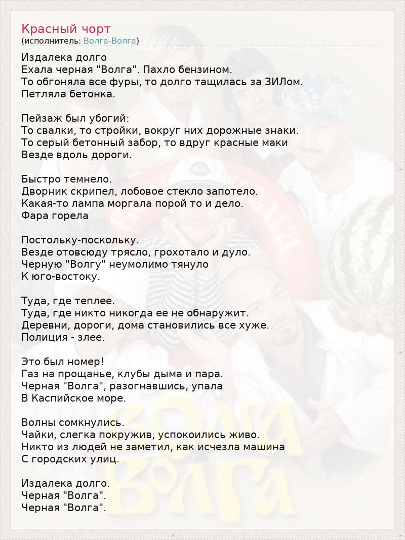 Издалека долго Ехала черная "Волга". Пахло бензином. То обгоняла все фуры, то долго тащилась за ЗИЛом. Петляла бетонка. Пейзаж был убогий: То свалки, то стройки, вокруг них дорожные знаки. То серый бетонный забор, то вдруг красные маки Везде вдоль дороги. Быстро темнело. Дворник скрипел, лобовое стекло запотело. Какая-то лампа моргала порой то и дело. Фара горела Постольку-поскольку. Везде отовсюду трясло, грохотало и дуло. Черную "Волгу" неумолимо тянуло К юго-востоку. Туда, где теплее. Туда, где никто никогда ее не обнаружит. Деревни, дороги, дома становились все хуже. Полиция - злее. Это был номер! Газ на прощанье, клубы дыма и пара. Черная "Волга", разогнавшись, упала В Каспийское море. Волны сомкнулись. Чайки, слегка покружив, успокоились живо. Никто из людей не заметил, как исчезла машина С городских улиц. Издалека долго. Черная "Волга". Черная "Волга".