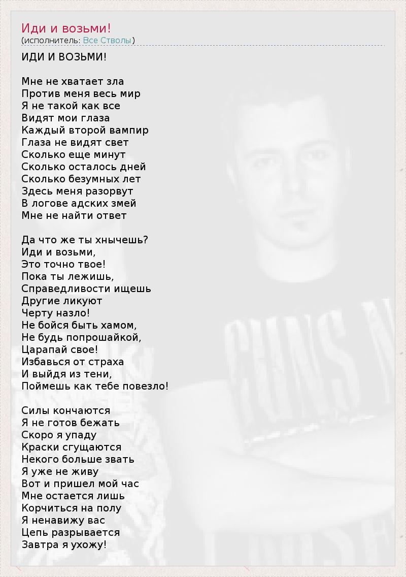 ИДИ И ВОЗЬМИ! Мне не хватает зла Против меня весь мир Я не такой как все Видят мои глаза Каждый второй вампир Глаза не видят свет Сколько еще минут Сколько осталось дней Сколько безумных лет Здесь меня разорвут В логове адских змей Мне не найти ответ Да что же ты хнычешь? Иди и возьми, Это точно твое! Пока ты лежишь, Справедливости ищешь Другие ликуют Черту назло! Не бойся быть хамом, Не будь попрошайкой, Царапай свое! Избавься от страха И выйдя из тени, Поймешь как тебе повезло! Силы кончаются Я не готов бежать Cкоро я упаду Краски сгущаются Некого больше звать Я уже не живу Вот и пришел мой час Мне остается лишь Корчиться на полу Я ненавижу вас Цепь разрывается Завтра я ухожу!