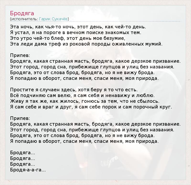 Эта ночь, как чья-то ночь, этот день, как чей-то день. Я устал, я на пороге в вечном поиске знакомых тем. Это утро чей-то блеф, этот день мое безумие, Эта леди дама треф из роковой породы оживленных мумий. Припев: Бродяга, какая странная масть, бродяга, какое дерзкое призвание. Этот город, город сна, прибежище глупцов и улиц без названия. Бродяга, это от слова брод, бродяга, но я не вижу брода. Я попадаю в оборот, спаси меня, спаси меня, моя природа. Простите я случаен здесь, хотя беру я то что есть. Всё подчиняю сам велю, я сам себя и ненавижу и люблю. Живу я так же, как жилось, гонюсь за тем, что не сбылось. Я сам себе и враг и друг, я сам себе порок и сам порочный круг. Припев: Бродяга, какая странная масть, бродяга, какое дерзкое призвание. Этот город, город сна, прибежище глупцов и улиц без названия. Бродяга, это от слова брод, бродяга, но я не вижу брода. Я попадаю в оборот, спаси меня, спаси меня, моя природа. Бродяга... Бродяга... Бродяга... Бродя-а-а-га...