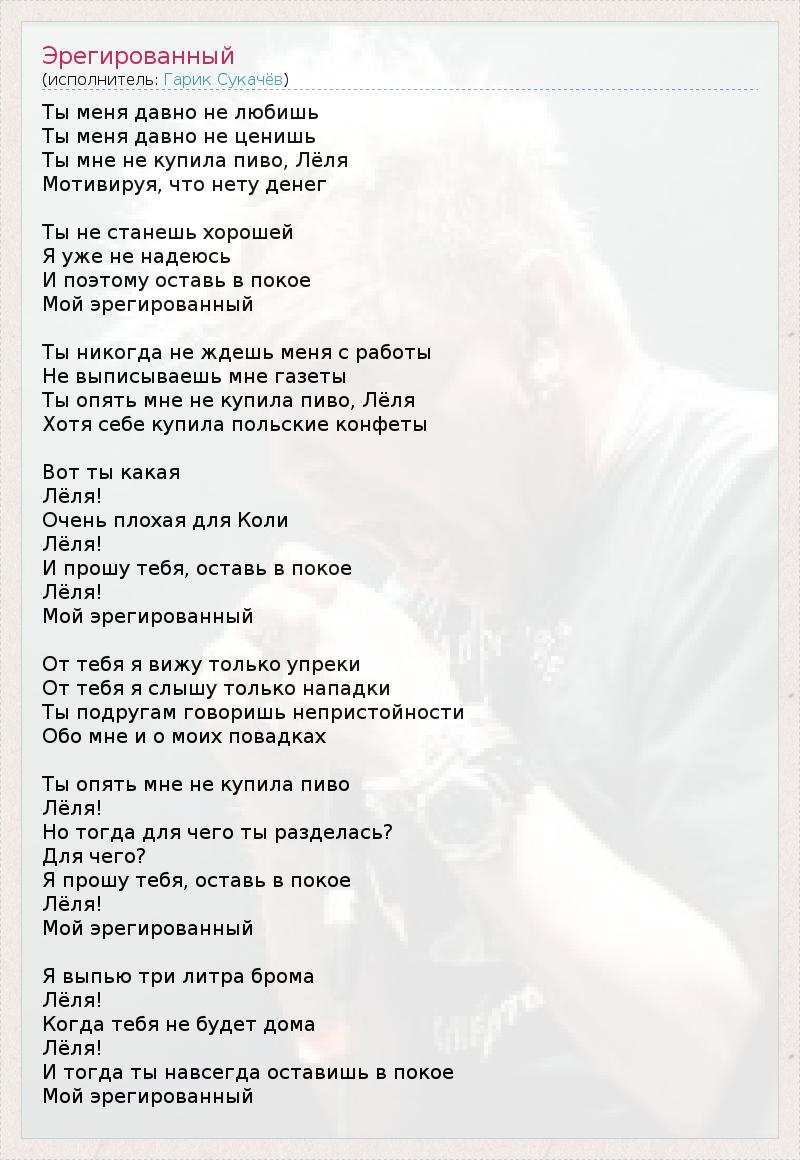 Ты меня давно не любишь Ты меня давно не ценишь Ты мне не купила пиво, Лёля Мотивируя, что нету денег Ты не станешь хорошей Я уже не надеюсь И поэтому оставь в покое Мой эрегированный Ты никогда не ждешь меня с работы Hе выписываешь мне газеты Ты опять мне не купила пиво, Лёля Хотя себе купила польские конфеты Вот ты какая Лёля! Очень плохая для Коли Лёля! И прошу тебя, оставь в покое Лёля! Мой эрегированный От тебя я вижу только упреки От тебя я слышу только нападки Ты подругам говоришь непристойности Обо мне и о моих повадках Ты опять мне не купила пиво Лёля! Hо тогда для чего ты разделась? Для чего? Я прошу тебя, оставь в покое Лёля! Мой эрегированный Я выпью три литра брома Лёля! Когда тебя не будет дома Лёля! И тогда ты навсегда оставишь в покое Мой эрегированный