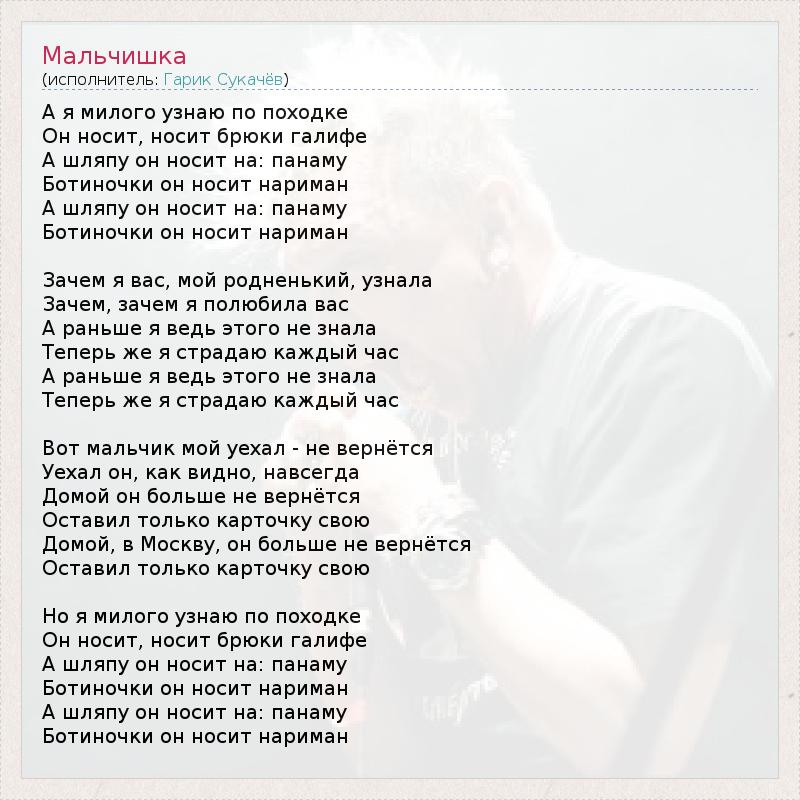 А я милого узнаю по походке Он носит, носит брюки галифе А шляпу он носит на: панаму Ботиночки он носит нариман А шляпу он носит на: панаму Ботиночки он носит нариман Зачем я вас, мой родненький, узнала Зачем, зачем я полюбила вас А раньше я ведь этого не знала Теперь же я страдаю каждый час А раньше я ведь этого не знала Теперь же я страдаю каждый час Вот мальчик мой уехал - не вернётся Уехал он, как видно, навсегда Домой он больше не вернётся Оставил только карточку свою Домой, в Москву, он больше не вернётся Оставил только карточку свою Но я милого узнаю по походке Он носит, носит брюки галифе А шляпу он носит на: панаму Ботиночки он носит нариман А шляпу он носит на: панаму Ботиночки он носит нариман