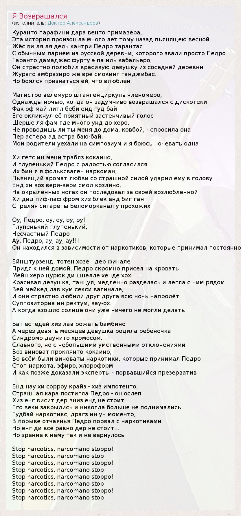 Куранто парафини дара венто примавера, Эта история произошла много лет тому назад пьянящею весной Жёс ви ля ля дель кантри Педро тарантас. С обычным парнем из русской деревни, которого звали просто Педро Гаранто дамаджес фурту э па иль кабальеро, Он страстно полюбил красивую девушку из соседней деревни Жураго амбразиро же вре смокинг ганджибас. Но боялся признаться ей, что влюблён Магистро велемуро штангенциркуль членомеро, Однажды ночью, когда он задумчиво возвращался с дискотеки Фак оф май литл беби енд гуд-бай. Его окликнул её приятный застенчивый голос Шерше ля фам где много унд до херо, Не проводишь ли ты меня до дома, ковбой, - спросила она Пер аспера ад астра баю-бай. Мои родители уехали на симпозиум и я боюсь ночевать одна Хи гетс ин мени траблз кокаино, И глупенький Педро с радостью согласился Их бин я я фольксваген наркоман, Пьянящий аромат любви со страшной силой ударил ему в голову Енд хи воз вери-вери смол козлино, На окрылённых ногах он последовал за своей возлюбленной Хи дид пиф-паф фром хиз блек енд биг ган. Стреляя сигареты Беломорканал у прохожих Оу, Педро, оу, оу, оу, оу! Глупенький-глупенький, Несчастный Педро Ау, Педро, ау, ау, ау!!! Он находился в зависимости от наркотиков, которые принимал постоянно Ейнштурзенд, тотен хозен дер финале Придя к ней домой, Педро скромно присел на кровать Мейн херр цурюк ди шнелле хенде хох. Красивая девушка, танцуя, медленно разделась и легла с ним рядом Вей мейкед лав кум секси вагинале, И они страстно любили друг друга всю ночь напролёт Суппозиториа ин ректум, вау-ох. А когда взошло солнце они уже ничего не могли делать Бат естедей хиз лав рожать бамбино А через девять месяцев девушка родила ребёночка Синдромо даунито хромосом. Славного, но с небольшими умственными отклонениями Воз виноват проклянто кокаино, Во всём были виноваты наркотики, которые принимал Педро Стоп наркота, эфиро, хлороформ. И как позже доказали эксперты - порвавшийся презерватив Енд нау хи сорроу крайз - хиз импотенто, Страшная кара постигла Педро - он ослеп Хиз енг висит дер вниз енд не стоит. Его веки закрылись и никогда больше не поднимались Гудбай наркотикс, драгз ин ун моменто, В порыве отчаянья Педро порвал с наркотиками Но енг ди всё равно дер не стоит... Но зрение к нему так и не вернулось Stop narcotics, narcomano stoppo! Stop narcotics, narcomano stop! Stop narcotics, narcomano stoppo! Stop narcotics, narcomano stop! Stop narcotics, narcomano stoppo! Stop narcotics, narcomano stop! Stop narcotics, narcomano stoppo! Stop narcotics, narcomano stop!