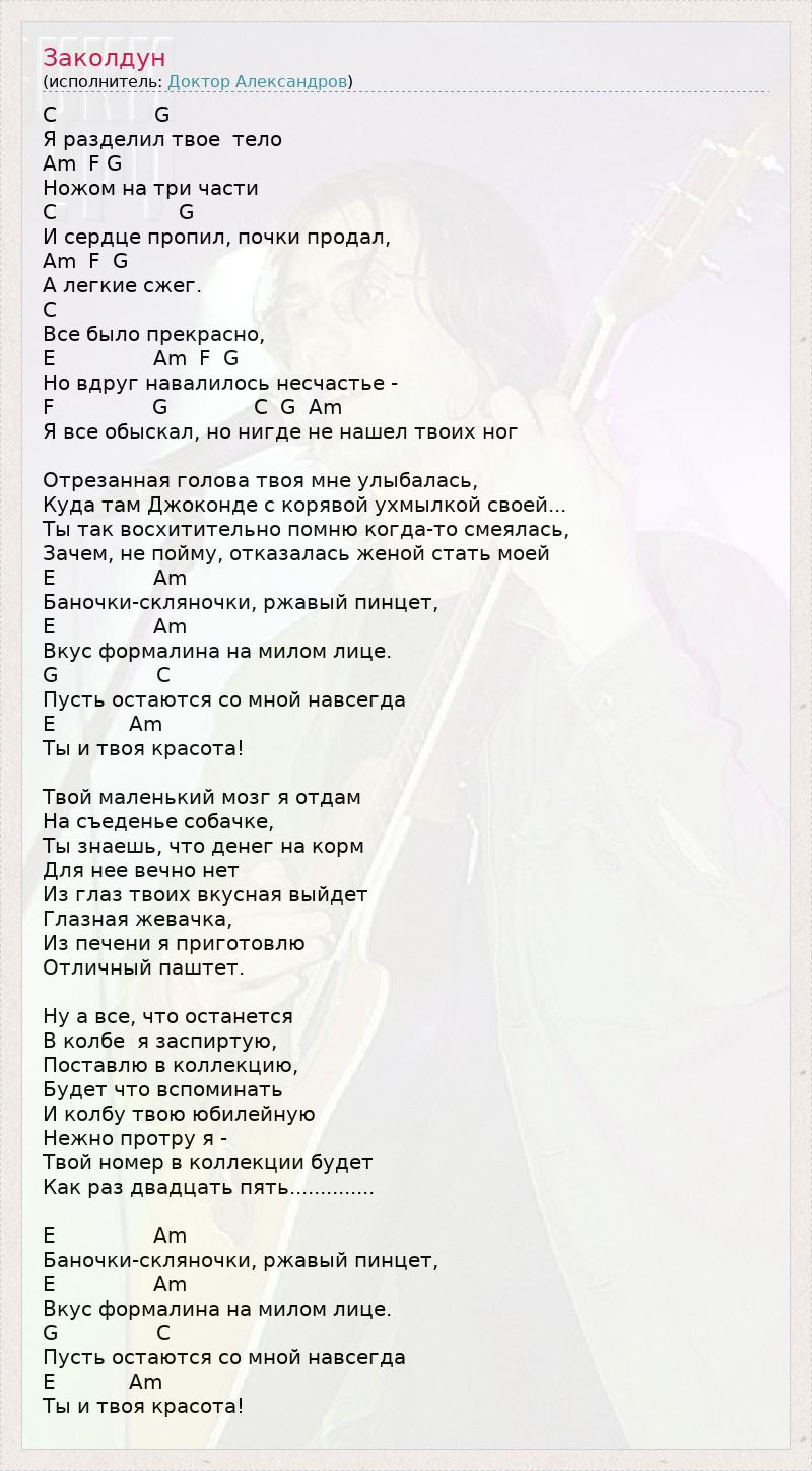 C G Я разделил твое тело Am F G Ножом на три части C G И сердце пропил, почки продал, Am F G А легкие сжег. C Все было прекрасно, E Am F G Но вдруг навалилось несчастье - F G C G Am Я все обыскал, но нигде не нашел твоих ног Отрезанная голова твоя мне улыбалась, Куда там Джоконде с корявой ухмылкой своей... Ты так восхитительно помню когда-то смеялась, Зачем, не пойму, отказалась женой стать моей E Am Баночки-скляночки, ржавый пинцет, E Am Вкус формалина на милом лице. G C Пусть остаются со мной навсегда E Am Ты и твоя красота! Твой маленький мозг я отдам На съеденье собачке, Ты знаешь, что денег на корм Для нее вечно нет Из глаз твоих вкусная выйдет Глазная жевачка, Из печени я приготовлю Отличный паштет. Ну а все, что останется В колбе я заспиртую, Поставлю в коллекцию, Будет что вспоминать И колбу твою юбилейную Нежно протру я - Твой номер в коллекции будет Как раз двадцать пять.............. E Am Баночки-скляночки, ржавый пинцет, E Am Вкус формалина на милом лице. G C Пусть остаются со мной навсегда E Am Ты и твоя красота!