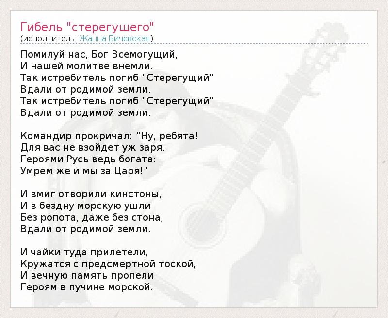 Помилуй нас, Бог Всемогущий, И нашей молитве внемли. Так истребитель погиб "Стерегущий" Вдали от родимой земли. Так истребитель погиб "Стерегущий" Вдали от родимой земли. Командир прокричал: "Ну, ребята! Для вас не взойдет уж заря. Героями Русь ведь богата: Умрем же и мы за Царя!" И вмиг отворили кинстоны, И в бездну морскую ушли Без ропота, даже без стона, Вдали от родимой земли. И чайки туда прилетели, Кружатся с предсмертной тоской, И вечную память пропели Героям в пучине морской.