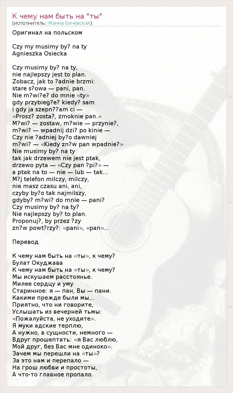 Оригинал на польском Czy my musimy by? na ty Agnieszka Osiecka Czy musimy by? na ty, nie najlepszy jest to plan. Zobacz, jak to ?adnie brzmi: stare s?owa — pani, pan. Nie m?wi?e? do mnie «ty» gdy przybieg?e? kiedy? sam i gdy ja szepn??am ci — «Prosz? zosta?, zmoknie pan.» M?wi? — zostaw, m?wie — przynie?, m?wi? — wpadnij dzi? po kinie — Czy nie ?adniej by?o dawniej m?wi? — «Kiedy zn?w pan wpadnie?» Nie musimy by? na ty tak jak drzewem nie jest ptak, drzewo pyta — «Czy pan ?pi?» — a ptak na to — nie — lub — tak... M?j telefon milczy, milczy, nie masz czasu ani, ani, czyby by?o tak najmilszy, gdyby? m?wi? do mnie — pani? Czy musimy by? na ty? Nie najlepszy by? to plan. Proponuj?, by przez ?zy zn?w powt?rzy?: «pani», «pan»... Перевод К чему нам быть на «ты», к чему? Булат Окуджава К чему нам быть на «ты», к чему? Мы искушаем расстоянье. Милее сердцу и уму Старинное: я — пан, Вы — пани. Какими прежде были мы... Приятно, что ни говорите, Услышать из вечерней тьмы: «Пожалуйста, не уходите». Я муки адские терплю, А нужно, в сущности, немного — Вдруг прошептать: «я Вас люблю, Мой друг, без Вас мне одиноко». Зачем мы перешли на «ты»? За это нам и перепало — На грош любви и простоты, А что-то главное пропало.