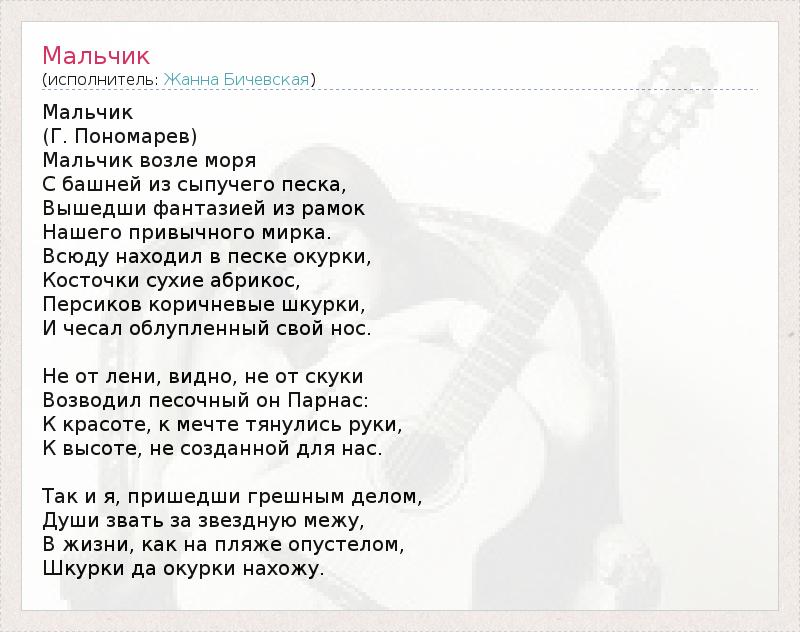 Это интересно:Жанна Владимировна Бичевская (родилась 17 июня 1944 в Москве) — народная артистка России. Живёт и работает в Москве.Жанна называет свой стиль «русский кантри-фолк». Репертуар певицы насчитывает несколько сотен произведений — песен духовного и общественного содержания, русских народных песен, а также на стихи поэтов «серебряного века».Окончила музыкальную школу по классу гитары.... продолжение
