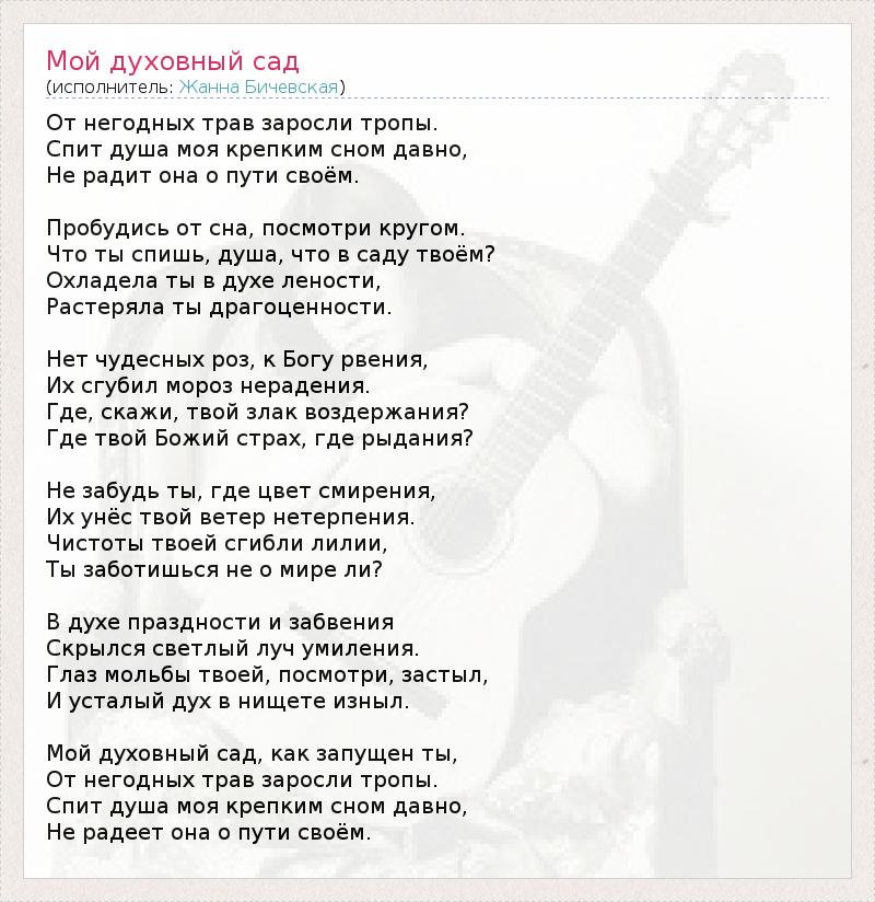 От негодных трав заросли тропы. Спит душа моя крепким сном давно, Не радит она о пути своём. Пробудись от сна, посмотри кругом. Что ты спишь, душа, что в саду твоём? Охладела ты в духе лености, Растеряла ты драгоценности. Нет чудесных роз, к Богу рвения, Их сгубил мороз нерадения. Где, скажи, твой злак воздержания? Где твой Божий страх, где рыдания? Не забудь ты, где цвет смирения, Их унёс твой ветер нетерпения. Чистоты твоей сгибли лилии, Ты заботишься не о мире ли? В духе праздности и забвения Скрылся светлый луч умиления. Глаз мольбы твоей, посмотри, застыл, И усталый дух в нищете изныл. Мой духовный сад, как запущен ты, От негодных трав заросли тропы. Спит душа моя крепким сном давно, Не радеет она о пути своём.