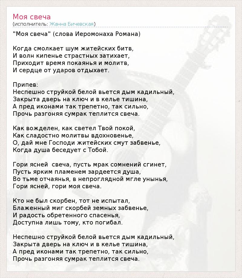 "Моя свеча" (слова Иеромонаха Романа) Когда смолкает шум житейских битв, И волн кипенье страстных затихает, Приходит время покаянья и молитв, И сердце от ударов отдыхает. Припев: Неспешно струйкой белой вьется дым кадильный, Закрыта дверь на ключ и в келье тишина, А пред иконами так трепетно, так сильно, Прочь разгоняя сумрак теплится свеча. Как вожделен, как светел Твой покой, Как сладостно молитвы вдохновенье, О, дай мне Господи житейских смут забвенье, Когда душа беседует с Тобой. Гори ясней свеча, пусть мрак сомнений сгинет, Пусть ярким пламенем зардеется душа, Во тьме отчаянья, в непроглядной мгле унынья, Гори ясней, гори моя свеча. Кто не был скорбен, тот не испытал, Блаженный миг скорбей земных забвенье, И радость обретенного спасенья, Доступна лишь тому, кто погибал. Неспешно струйкой белой вьется дым кадильный, Закрыта дверь на ключ и в келье тишина, А пред иконами так трепетно, так сильно, Прочь разгоняя сумрак теплится свеча.