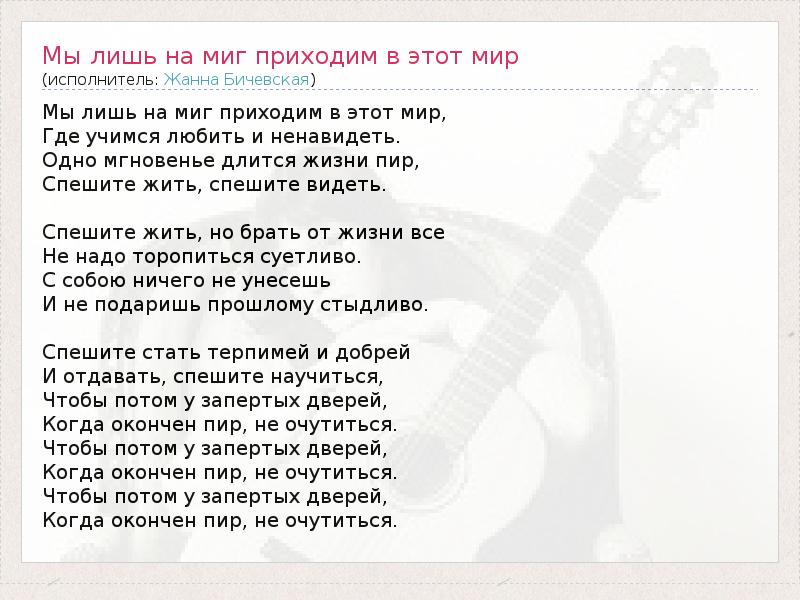 Мы лишь на миг приходим в этот мир, Где учимся любить и ненавидеть. Одно мгновенье длится жизни пир, Спешите жить, спешите видеть. Спешите жить, но брать от жизни все Не надо торопиться суетливо. С собою ничего не унесешь И не подаришь прошлому стыдливо. Спешите стать терпимей и добрей И отдавать, спешите научиться, Чтобы потом у запертых дверей, Когда окончен пир, не очутиться. Чтобы потом у запертых дверей, Когда окончен пир, не очутиться. Чтобы потом у запертых дверей, Когда окончен пир, не очутиться.