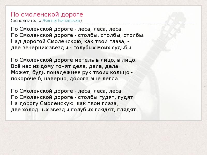 А как ты думаешь, о чем песня "По смоленской дороге" ?