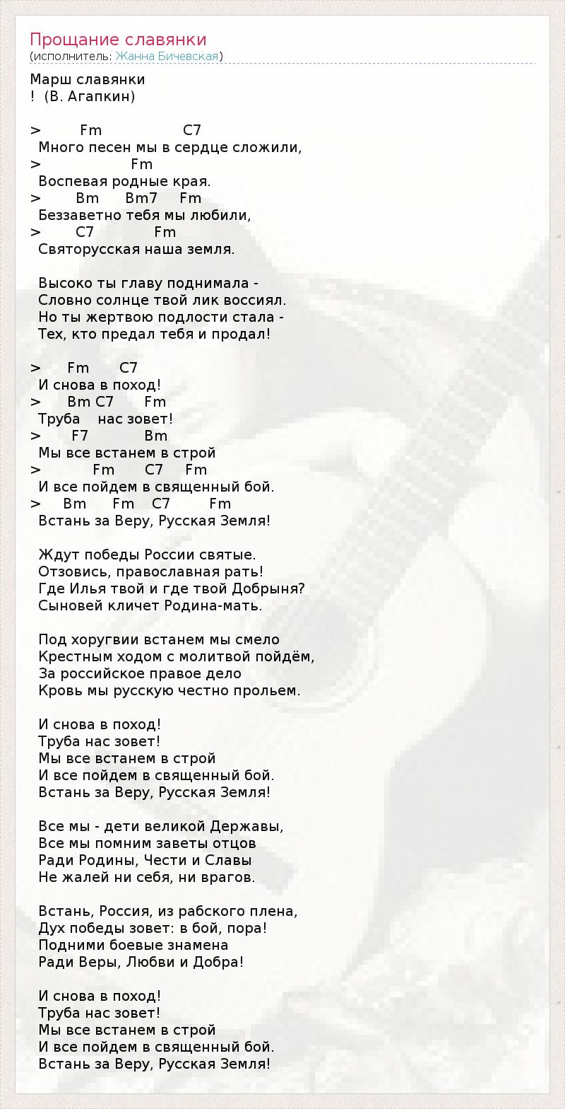Это интересно:Жанна Владимировна Бичевская (родилась 17 июня 1944 в Москве) — народная артистка России. Живёт и работает в Москве.Жанна называет свой стиль «русский кантри-фолк». Репертуар певицы насчитывает несколько сотен произведений — песен духовного и общественного содержания, русских народных песен, а также на стихи поэтов «серебряного века».Окончила музыкальную школу по классу гитары.... продолжение