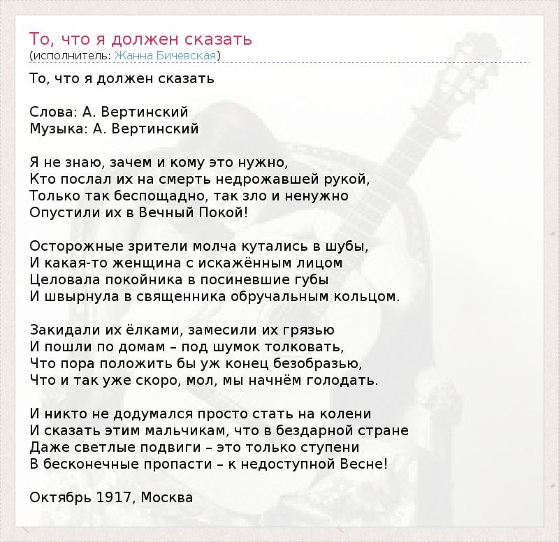 То, что я должен сказать Слова: А. Вертинский Музыка: А. Вертинский Я не знаю, зачем и кому это нужно, Кто послал их на смерть недрожавшей рукой, Только так беспощадно, так зло и ненужно Опустили их в Вечный Покой! Осторожные зрители молча кутались в шубы, И какая-то женщина с искажённым лицом Целовала покойника в посиневшие губы И швырнула в священника обручальным кольцом. Закидали их ёлками, замесили их грязью И пошли по домам – под шумок толковать, Что пора положить бы уж конец безобразью, Что и так уже скоро, мол, мы начнём голодать. И никто не додумался просто стать на колени И сказать этим мальчикам, что в бездарной стране Даже светлые подвиги – это только ступени В бесконечные пропасти – к недоступной Весне! Октябрь 1917, Москва