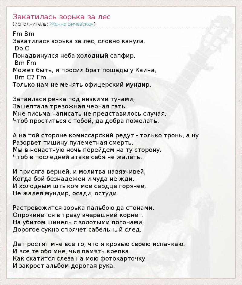 Fm Bm Sunset Dawn of the forest, as if sunk. Db C Ponadvinulsya cold sapphire sky. Bm Fm Maybe I ask for mercy brother Cain, Bm C7 Fm Only we did not change the officer's uniform. Hidden river under low clouds Whispered a disturbing black causeway. I do not write letters imagined case To say goodbye to you, but the good wish. And on the other side of the commissar redoubt - just touch, as well Break the silence of machine-gun death. We are in the rainy night we pass to the other side. To the last attack himself to spare. And oath true and obsessive prayer, When the fight is hopeless and do not expect a miracle. And cold bayonet my heart warm, Sparing no uniform, siege, cool. Stir Dawn firing but groans. It tips over the grass yesterday cornet. On murdered his coat with gold epaulettes, Dear cloth hide saber trail. Forgive me what I have to get dirty with their own blood, And all those about me, whose memory is strong. As a tear rolled down my photograph And the album closes dear hand.
